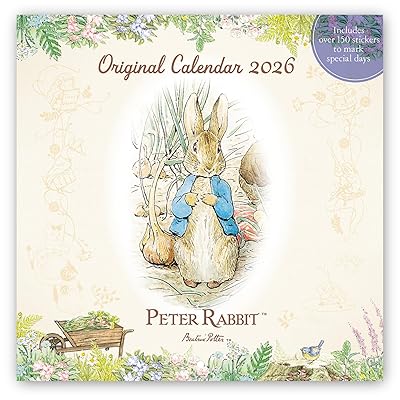 落ち着いた色合いのピーターラビットの壁掛けカレンダー。メモ欄も比較的大き目。便利なスケジュールシール入り!